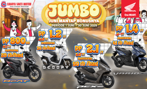 Promo JUMBO (Juni Mantap Bonusnya) dari Cahaya Sakti Motor bikin kamu bisa punya motor impian dengan DP super ringan dan angsuran harian yang ramah di kantong.